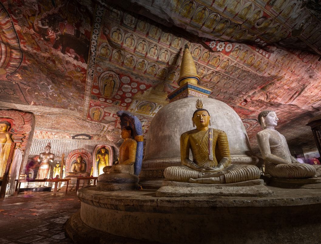 The Dambulla Cave Temple, also known as the Golden Temple of Dambulla, dates back to the 1st century BCE. Carved into a massive 160-meter rock, the complex consists of five main caves housing over 150 Buddha statues and intricate murals depicting the life of Lord Buddha. The temple has been a center of Buddhist worship and meditation for over two millennia, making it a significant religious and cultural landmark.